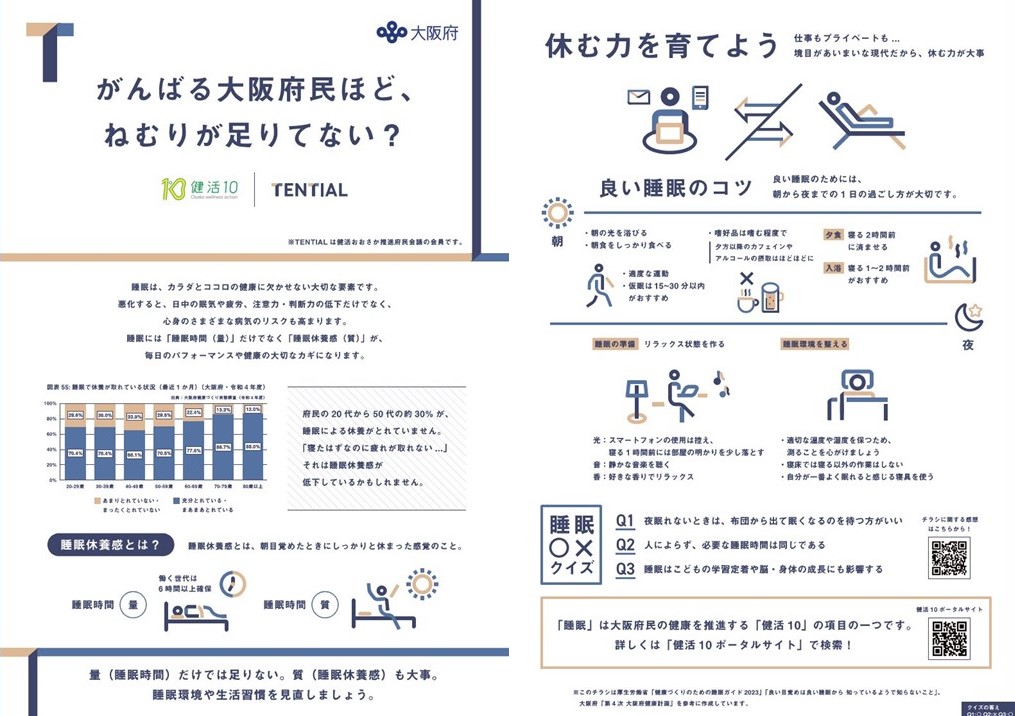 健活おおさか推進府民会議の会員である株式会社TENTIAL様と連携し、睡眠に関する啓発チラシ「がんばる⼤阪府⺠ほど、ねむりが⾜りてない?」を作成しました。健康のカギとなる「睡眠休養感」や良い睡眠のコツをご紹介しています。