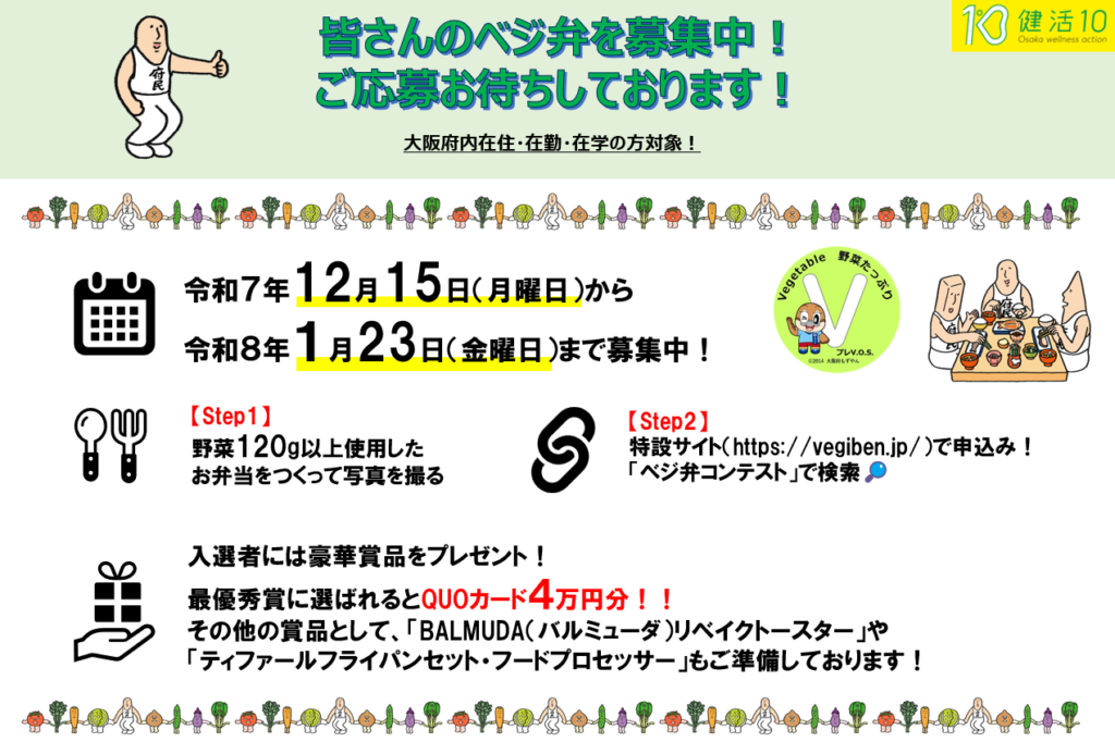 大阪府では、V.O.S.(※1)の認知度を高め、より多くの皆さまにV.O.S.を実践していただくことを目的に、イベントの開催やSNS等の広報による啓発に取り組んでいます。このたび啓発活動の一環として、大阪府V.O.S.事業「ベジ弁(野菜たっぷりお弁当)コンテスト」を開催します。