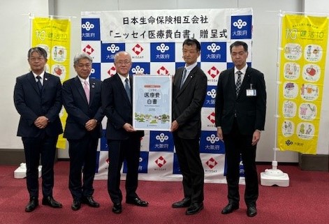このたび、日本生命保険相互会社が匿名医療保険等関連情報データベース (NDB)(※1)のデータを活用して作成した「ニッセイ医療費白書」(※2)を全国に先駆けて大阪府に提供いただき、贈呈式を行いましたのでお知らせいたします。