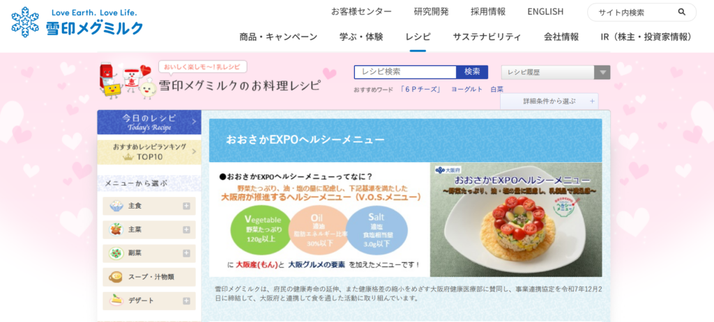 〇雪印メグミルク株式会社ホームページにおける、「おおさかEXPOヘルシーメニュー」の掲載(掲載終了日は未定)