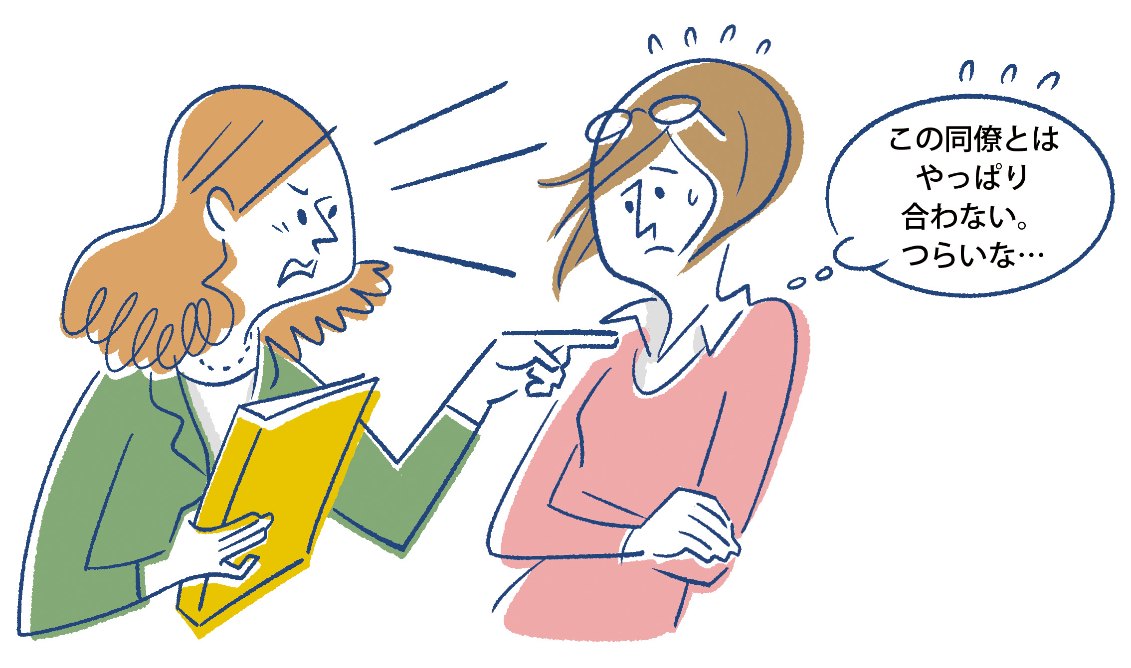 Nさんは職場の同僚と以前はうまくやっていましたが、一度、きつい口調で注意をされたことをきっかけに苦手意識を持つようになりました。同僚の態度も、指示の出し方が高圧的になるなど以前と変わり、Nさんの苦手意識はますます強まって、同僚との関係がギクシャクしています。
